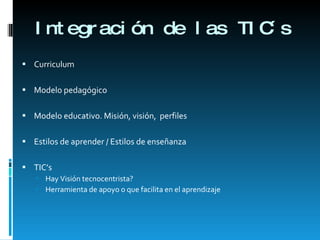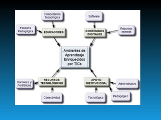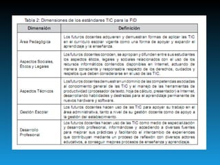 El documento habla sobre las herramientas TIC que pueden usarse en el aula. Describe los componentes de un currículo educativo y cómo las TIC pueden integrarse en el modelo pedagógico. Además, explica el diseño instruccional para aplicar las TIC y los roles del profesor y estudiante en este contexto. Finalmente, resume los estándares TIC para la formación inicial de docentes.