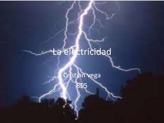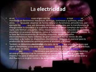 La electricidad es un fenómeno físico originado por cargas eléctricas cuya energía se manifiesta en diversos fenómenos. Se puede observar de forma natural en rayos y procesos biológicos, y es la base del funcionamiento de máquinas y dispositivos electrónicos. La electricidad también se refiere al estudio de las leyes que rigen este fenómeno y a su aplicación tecnológica, siendo una forma de energía importante desde que Faraday descubrió cómo producir corriente eléctrica mediante inducción.