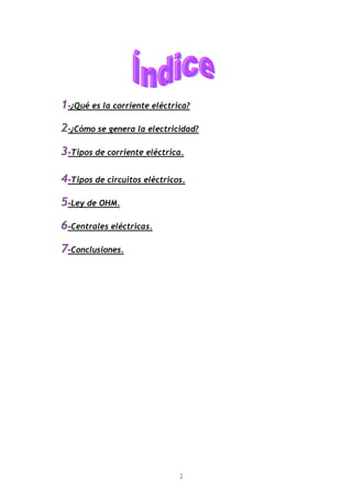 Este documento resume los conceptos básicos de la electricidad, incluyendo la definición de corriente eléctrica, los tipos de corriente (continua y alterna), los circuitos eléctricos, la ley de Ohm y los diferentes tipos de centrales eléctricas como las térmicas, hidroeléctricas, nucleares, eólicas y solares. El documento concluye que el trabajo realizado fue interesante y permitió aprender nuevos conceptos sobre la generación y distribución de la electricidad.