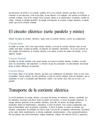 1) El documento describe los orígenes y propiedades básicas de la electricidad, incluyendo que surge de la presencia de electrones y protones en la materia y puede manifestarse como carga, corriente, campos eléctricos y magnetismo.