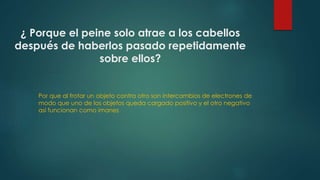 El documento trata sobre conceptos básicos de electricidad. Explica que al frotar un peine contra el cabello repetidamente, se produce una transferencia de electrones que deja al peine cargado positivamente y al cabello negativamente, atrayéndose como imanes. También indica que los conductores eléctricos suelen estar recubiertos de plástico para evitar fugas o daños de la corriente eléctrica que transportan. Finalmente, define la fuerza electromotriz como la causa que mantiene una diferencia de potencial entre dos p