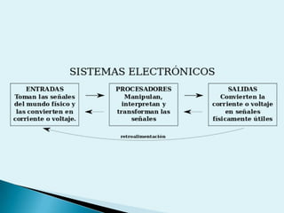 El documento trata sobre electrónica. Explica que la electrónica estudia y aplica la producción, procesamiento y control de señales eléctricas a través de gases, vacío o materiales conductores. También estudia dispositivos como tubos, diodos y transistores. Luego describe brevemente el funcionamiento del diodo y transistor.