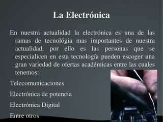 La electrónica es una de las ramas tecnológicas más importantes actualmente y ofrece una variedad de especializaciones académicas. El Instituto Tecnológico Superior "Carlos Cisneros" forma profesionales en electrónica considerando aspectos humanísticos. Los técnicos adquieren conocimientos de electrónica digital e industrial para diseñar, construir y reparar circuitos. La electrónica se ha desarrollado impresivamente y es esencial en la automatización, computadoras y ahorro de trabajo humano, siendo el