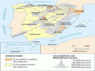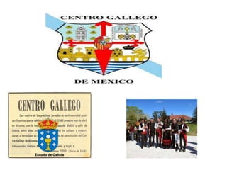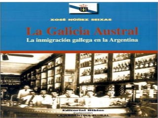 El documento resume la historia de la emigración gallega desde la segunda mitad del siglo XIX debido a la crisis económica en Galicia. Miles de gallegos emigraron a países de América como Argentina, Cuba y Brasil en busca de mejores oportunidades laborales. Aunque muchos gallegos salieron de puertos como La Coruña y Vigo, pocos regresaron, estableciéndose permanentemente en los países receptores y trabajando principalmente en agricultura, servicios y pequeño comercio. Los gallegos formaron asoci