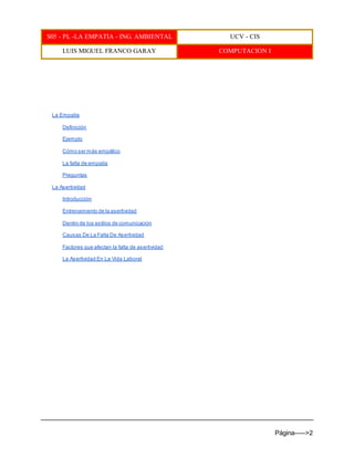 Este documento trata sobre la empatía y la asertividad. Define la empatía como la capacidad de ponerse en el lugar del otro y comprender sus sentimientos y pensamientos. Explica cómo ser más empático y los efectos de la falta de empatía. También define la asertividad como la habilidad de defender los propios derechos respetando a los demás. Discutes formas de entrenar la asertividad y causas comunes de la falta de asertividad. Finalmente, explora la importancia de la asertividad en el á
