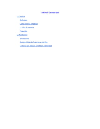 Este documento trata sobre la empatía y la asertividad. Define la empatía como la capacidad de ponerse en el lugar de otro y comprender sus sentimientos. Explica que ser más empático implica prestar atención a los demás y esforzarse por entender su perspectiva. También describe la falta de empatía y algunas preguntas para evaluar la propia empatía. Luego introduce la asertividad y sus características, como aceptar la realidad y actuar con base en hechos. Finalmente, identifica factores como la falta