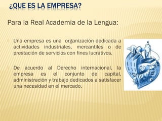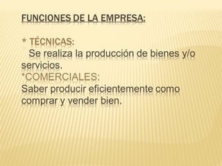 La empresa es una organización económica y social que tiene como objetivo generar bienes y/o servicios para satisfacer las necesidades humanas mediante técnicas administrativas como planificar, organizar, dirigir y controlar. Su fin es lucrativo y contribuye al bienestar de la comunidad a través de la generación de empleos y pago de impuestos. Existen diferentes tipos de empresas clasificadas por su tamaño, sector económico, forma jurídica y otros factores.