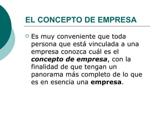 La empresa es una organización social formada por recursos humanos, materiales y capital, con el objetivo de producir bienes y servicios para obtener utilidades. Puede ser privada o pública, clasificándose también por su actividad (industrial, comercial o de servicios), tamaño (microempresa, pequeña, mediana o gran empresa) y estructura jurídica (empresa individual o sociedades).