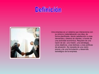 Este documento define una empresa y explica que es un sistema que interactúa con su entorno para satisfacer las demandas de los clientes a través de una actividad económica. Describe las clasificaciones de las empresas por tamaño, origen de capital, funciones y sectores económicos. También resume los principales departamentos de una empresa como producción, finanzas, recursos humanos, comercial y administración, y sus funciones correspondientes.