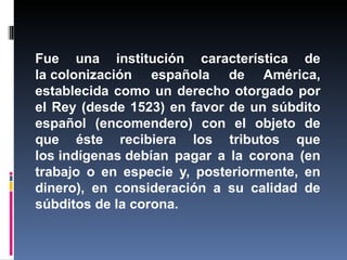 La encomienda fue una institución de la colonización española en América que otorgaba a los encomenderos el derecho de recibir tributos de los indígenas a cambio de protegerlos y evangelizarlos. La encomienda tenía como objetivo principal la tributación indígena a la corona española. Aunque se suponía que también debía proteger a los indígenas, con el tiempo llevó a abusos y a la explotación del trabajo indígena. La mita era una institución similar que obligaba a los indígenas a