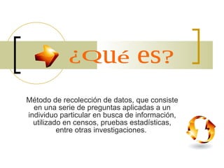 Este documento describe los tipos y métodos de encuestas. Explica que una encuesta es una técnica de recolección de datos mediante preguntas a individuos para obtener información. Detalla que existen encuestas directas e indirectas, y que las preguntas pueden ser abiertas o cerradas. Además, provee consejos para diseñar una encuesta efectiva como definir objetivos claros y formular preguntas sencillas.