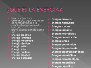 Este documento lista y brinda una breve explicación de los diferentes tipos de energía, incluyendo la energía eléctrica, lumínica, mecánica, térmica, eólica, solar, nuclear, cinética, potencial, química, hidráulica, sonora, radiante, fotovoltaica, de reacción, iónica, geotérmica, mareomotriz, electromagnética, metabólica, hidroeléctrica, magnética y calorífica.