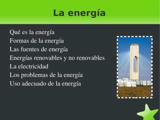 El documento habla sobre la energía, sus diferentes formas como la cinética, luminosa, térmica, química y eléctrica. Explica las fuentes de energía renovables como el agua, viento y sol, y no renovables como el carbón, petróleo y gas natural. También describe cómo se obtiene la electricidad de centrales térmicas, eólicas, solares y nucleares. Finalmente, menciona los problemas relacionados con el consumo de energía como la contaminación y agotamiento de recursos, y la importancia de usarla de forma