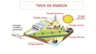 El documento describe los diferentes tipos de energía, incluyendo la energía química, térmica, mecánica, electromagnética, luminosa, eléctrica, nuclear, hidráulica, eólica, solar, geotérmica, mareomotriz y metabólica. Cada tipo de energía se manifiesta de manera diferente dependiendo de su fuente y puede transformarse en otros tipos de energía.