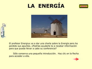 El documento presenta una serie de actividades para ayudar a un profesor a preparar una conferencia sobre la energía. Las actividades incluyen definir diferentes formas de energía como la solar, eólica y cinética; clasificar fuentes de energía como renovables o no renovables; y explicar conceptos como ahorro energético y combustibles fósiles.