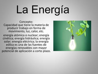 El documento describe los diferentes tipos de energía, incluyendo energía eléctrica, lumínica, mecánica, térmica, eólica, solar, nuclear, cinética, potencial, química, hidráulica, sonora, radiante, fotovoltaica, de reacción, iónica, geotérmica y mareomotriz. Explica brevemente cada tipo de energía, sus características y cómo se produce o utiliza.