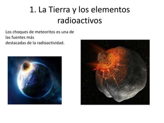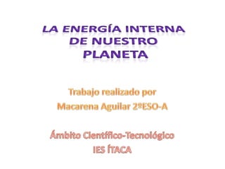 Este documento trata sobre los procesos geológicos internos de la Tierra. Explica que la Tierra está dividida en capas y que los choques de meteoritos son una fuente de radioactividad. Describe las corrientes de convección en el manto y cómo esto puede dar lugar a volcanes. Explica los diferentes tipos de volcanes, terremotos, placas tectónicas y cómo estos procesos dan forma al relieve terrestre.
