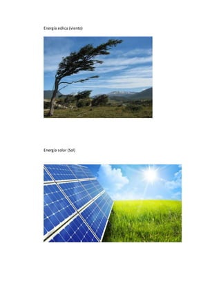 El documento proporciona información sobre diferentes tipos de energía renovable y no renovable. Define la energía renovable como aquella que se obtiene de recursos naturales que se renuevan continuamente, como la energía mareomotriz, hidráulica, eólica y solar. También describe brevemente algunas fuentes de energía no renovable como el petróleo, carbón y gas natural, que se agotan con su uso.