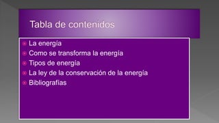 Este documento describe los diferentes tipos de energía, incluyendo energía eléctrica, lumínica, mecánica, térmica, eólica, solar, nuclear, cinética y potencial. Explica que la energía puede transformarse de una forma a otra y que la cantidad total de energía en un sistema aislado se conserva de acuerdo con la ley de conservación de la energía.