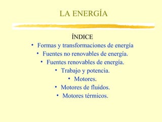 Este documento proporciona una introducción general a los conceptos de energía, incluyendo sus diferentes formas, transformaciones y fuentes. Explica que la energía puede manifestarse como energía mecánica, eléctrica, térmica, luminosa, nuclear, química y más. También describe las fuentes renovables como la solar, eólica, hidráulica y biomasa, y las no renovables como el petróleo, carbón, gas natural y uranio. Por último, introduce conceptos como trabajo, potencia y los diferentes tipos de motores.