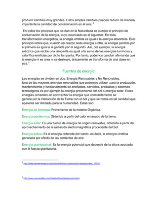 La energía es fundamental para realizar actividades y se puede conservar reduciendo su uso innecesario o mejorando la eficiencia. Existen energías renovables como la solar, eólica y de biomasa, así como no renovables como el petróleo, carbón y gas natural. La conservación de la energía es importante para ahorrar recursos no renovables y reducir la contaminación mediante cambios sencillos en los hábitos de las personas.