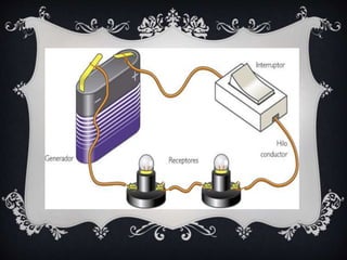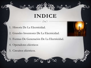 Este documento trata sobre la electricidad y contiene información sobre su historia, grandes inventores como Benjamin Franklin y Nikola Tesla, formas de generación como la termoeléctrica e hidroeléctrica, operadores eléctricos como generadores y receptores, y circuitos eléctricos. Explica conceptos básicos de electricidad como magnitudes eléctricas y tipos de circuitos.