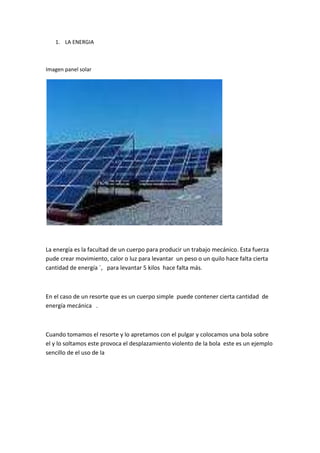 El documento habla sobre diferentes fuentes de energía como los paneles solares, el agua, la fuerza eólica y el carbón. Explica brevemente cómo funcionan los paneles solares para generar energía y cómo se han utilizado en Japón. También describe cómo el agua puede generar energía a través de las corrientes de los ríos y el almacenamiento de agua. Brevemente menciona que la fuerza eólica apenas se usa hoy en día y que el carbón se usa principalmente en altos hornos y centrales eléctricas