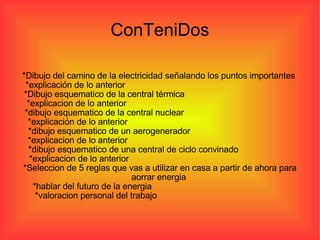 Este documento resume las principales fuentes de energía eléctrica como centrales térmicas, nucleares, aerogeneradores y de ciclo combinado. Explica brevemente cómo funcionan cada una y los procesos involucrados en la generación de electricidad. También incluye cinco reglas para ahorrar energía en el hogar y discute los futuros desafíos energéticos como el cambio climático y la necesidad de reducir las emisiones contaminantes.