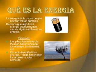 El documento trata sobre los diferentes tipos de energía, incluyendo energía mecánica, química, calorífica, eléctrica y nuclear. Explica que la energía puede transformarse de un tipo a otro y da ejemplos como la transformación de energía química a mecánica en un cohete. También habla sobre las fuentes de energía renovables como la luz solar y el viento, versus las no renovables como el petróleo y el carbón.