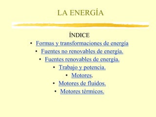 Este documento presenta información sobre diferentes temas relacionados con la energía. Explica las diferentes formas y transformaciones de energía, así como las fuentes renovables y no renovables. También describe conceptos como el trabajo, la potencia y los diferentes tipos de motores, incluyendo motores de fluidos y motores térmicos. El documento contiene varias secciones e índices para organizar la información de manera clara.