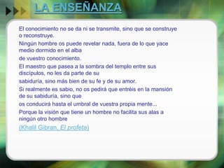 El documento habla sobre la enseñanza. Resume que el conocimiento se construye y no se transmite directamente, y que los maestros guían a los estudiantes hacia su propio conocimiento en lugar de darles su sabiduría. Además, explica que la visión de un hombre no puede facilitar las alas de otro.
