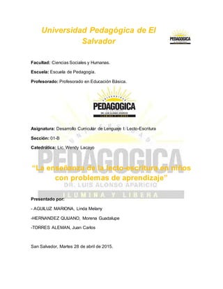 El documento analiza la enseñanza de la lecto-escritura en niños con problemas de aprendizaje, enfocándose en trastornos como dislexia, discalculia y TDAH, y su impacto en el rendimiento académico y emocional. Se plantean objetivos para identificar y abordar estas dificultades en el aula mediante metodologías adecuadas y un enfoque educativo sensible. Los autores destacan la importancia del rol docente en la identificación, seguimiento y tratamiento de estos trastornos para facilitar un aprendizaje significativo.