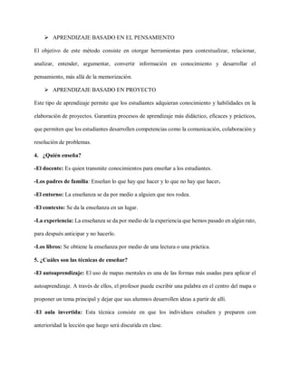 Este documento describe la enseñanza como el proceso de transmisión de conocimientos entre seres humanos en diversos ámbitos. Explora los tipos de enseñanza individual y grupal, y los métodos más eficaces como el aprendizaje cooperativo, clases invertidas, basado en el pensamiento y proyectos. También examina quiénes enseñan, las técnicas como el autoaprendizaje y debates, y cómo se lleva a cabo la enseñanza a través de estudiantes, saber, centros educativos y profesores.