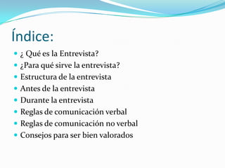 Este documento describe la entrevista de trabajo, incluyendo su definición, propósito, estructura, consejos para antes, durante y después de la entrevista. El propósito principal de una entrevista de trabajo es para que el empleador pueda evaluar si el candidato es adecuado para el puesto y para que el candidato pueda determinar si el trabajo y la empresa son de su interés. La estructura típica de una entrevista incluye una introducción, sección de desarrollo con preguntas, y conclusión. Es importante que el candidato se prepare