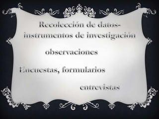 El documento describe la observación como una técnica de estudio esencial utilizada en todas las ramas de la ciencia. Antes de la observación, el observador debe familiarizarse con el medio y realizar ensayos previos para memorizar los aspectos a observar. Durante la observación, el observador debe registrar las notas con prontitud, incluyendo las acciones realizadas. La entrevista también se usa en investigación social de forma similar al cuestionario, con la diferencia de que es el encuestador quien anota las respuestas.