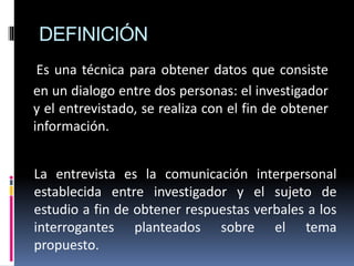 Este documento define la entrevista como una técnica de investigación que consiste en un diálogo entre el entrevistador y el entrevistado con el fin de obtener información. Explica que existen diferentes tipos de entrevistas como estructuradas, de opinión e informativas. También describe las etapas del proceso de entrevista como la preparación, producción, entrevista personal y adición. Finalmente, concluye que la entrevista es una herramienta útil para la investigación social siempre que el entrevistador esté capacitado para manejarla