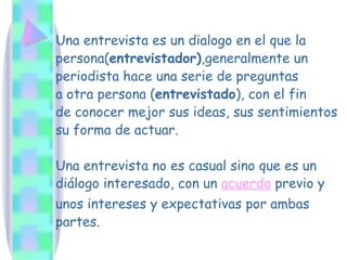 Una entrevista es un diálogo entre dos o más personas, generalmente un periodista y una persona de interés, con el objetivo de recopilar información e ideas a través de preguntas. Existen diferentes tipos de entrevistas como de información, diagnóstico o selección. Una entrevista requiere preparación por parte del entrevistador y entrevistado para asegurar que fluya de manera efectiva y se obtenga la información deseada.