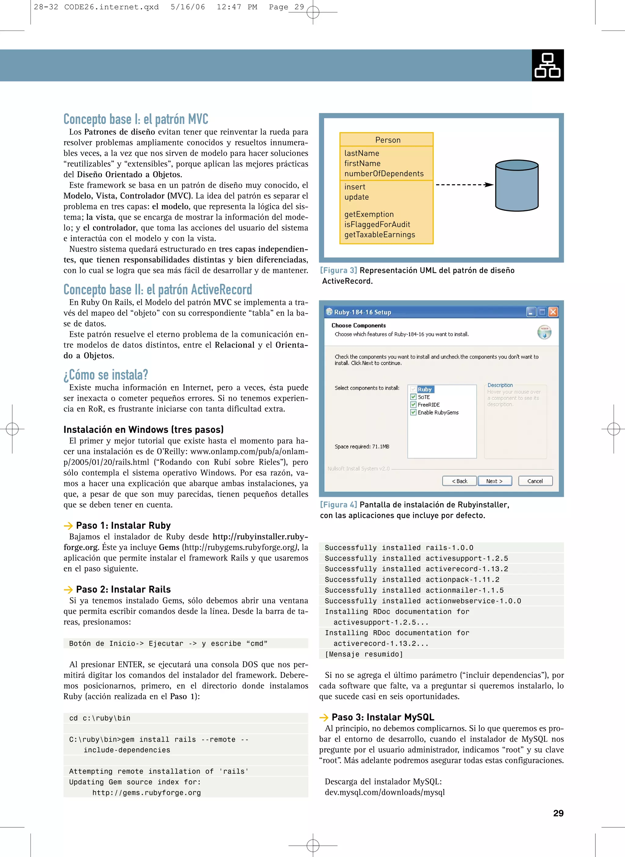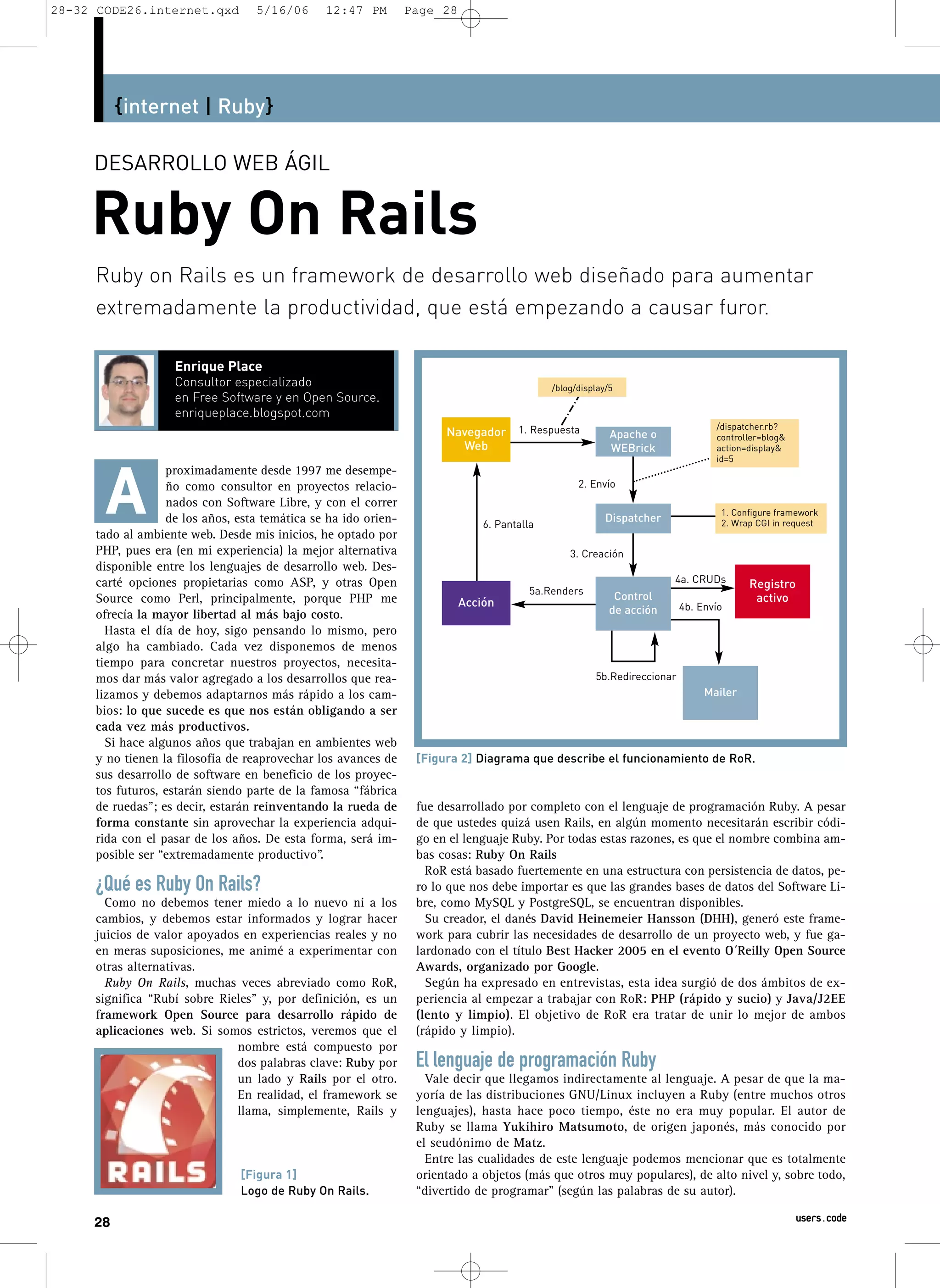 El documento describe Ruby on Rails, un framework de desarrollo web ágil. Explica que Rails se basa en los patrones MVC y Active Record para separar la lógica de la interfaz y mapear objetos a tablas de base de datos. También detalla los tres pasos para instalar Rails en Windows, que incluyen descargar e instalar Ruby e instalar Rails a través de Gems.