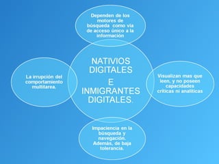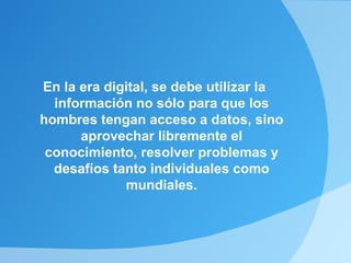Este documento presenta información sobre la era digital y las diferencias entre nativos digitales e inmigrantes digitales. Se discute la importancia de que tanto estudiantes como profesores aprovechen las tecnologías digitales para resolver problemas, compartir conocimiento y mejorar el aprendizaje. El documento enfatiza la necesidad de que profesores y estudiantes se involucren conjuntamente en el uso de la tecnología digital.