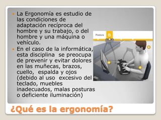 La ergonomía informática se enfoca en prevenir dolores y lesiones causados por el uso excesivo del teclado, muebles inadecuados y malas posturas al usar computadoras. Recomienda realizar descansos cada hora, ejercicios oculares como parpadear y girar los ojos, y ejercicios para las manos como lavarlas con agua fría para mejorar la circulación y aliviar molestias.