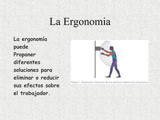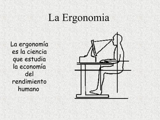 La ergonomía estudia la economía del rendimiento humano y propone soluciones para eliminar o reducir los efectos negativos del trabajo sobre los trabajadores, identificando riesgos ergonómicos mediante el análisis de tareas y mejorando las condiciones para reducir lesiones, mejorar la salud, eficiencia y productividad.