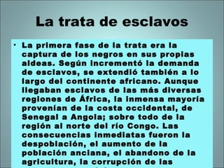 Este documento resume la historia de la esclavitud en América durante la época colonial, incluyendo la trata de esclavos desde África y su introducción en diferentes países y regiones de América. Explica cómo los esclavos africanos fueron transportados en grandes cantidades a partir del siglo XVI a países como España, Portugal, Inglaterra y Holanda para ser utilizados como mano de obra forzada. También describe la presencia significativa de esclavos y sus descendientes en ciudades importantes como Lima y Cartagena.