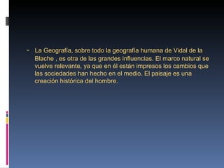 Este documento presenta las ideas fundamentales de la Escuela de los Annales, incluyendo su énfasis en estudiar a las sociedades como unidades en el tiempo y el espacio, así como su interdisciplinariedad e influencia de disciplinas como la geografía y la sociología. También resume la creación de la revista Annales y las contribuciones de figuras clave como Lucien Febvre y Marc Bloch. Finalmente, resume la tercera generación de historiadores de Annales y su énfasis en temas como la historia cultural y las representaciones.