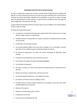 La Liga Internacional de la Escuela Nueva se fundó en 1921 para reunir las ideas pedagógicas sobre una escuela pública experimental y centrada en el niño. Los principios de la Liga incluyen que la escuela debe ser un laboratorio donde los estudiantes aprendan a través de proyectos grupales y actividades prácticas como deportes y música, en lugar de premios y castigos. La enseñanza debe adaptarse a los intereses y necesidades individuales de cada estudiante.