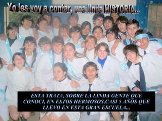 El documento es una historia escrita por un alumno sobre sus casi 5 años en la Escuela Comercio 1. Expresa su agradecimiento por los buenos momentos y amigos que encontró allí, aunque también hubo peleas y discusiones. Considera a la escuela su segunda casa y está agradecido por la experiencia única de pasar por sus aulas. Sobre todo, está agradecido con sus compañeros, a quienes considera como hermanos y amigos que siempre lo ayudaron cuando tropezó.