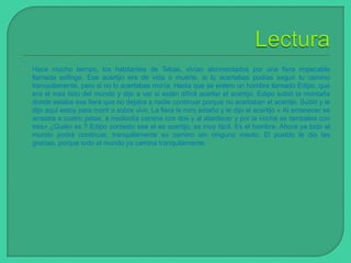 La esfinge planteaba un acertijo a los habitantes de Tebas que significaba vida o muerte. Edipo, el hombre más listo, resolvió el acertijo permitiendo que la gente continuara su camino sin miedo. El acertijo era "Al amanecer se arrastra a cuatro patas, a mediodía camina con dos y al atardecer y por la noche se tambalea con tres", cuya respuesta es "el hombre". El pueblo agradeció a Edipo por haber salvado sus vidas.