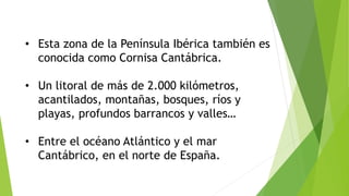 La España Verde se refiere a la zona noroeste de la Península Ibérica bañada por el mar Cantábrico, que incluye las regiones de Galicia, Asturias, Cantabria y el País Vasco. Esta región se caracteriza por su clima oceánico, bosques caducifolios, variada costa con playas y acantilados, y pueblos pesqueros. También alberga importantes patrimonios naturales como los Picos de Europa y culturales como las cuevas de Altamira, y destaca por su turismo de
