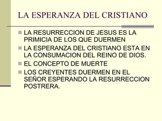 El documento habla sobre la esperanza del cristiano. Explica que la resurrección de Jesús es la garantía de la resurrección de los creyentes. Además, dice que tener esperanza llena de alegría y paz, y que Jesús enseñó a vivir con esperanza y confianza en Dios a pesar de los problemas.