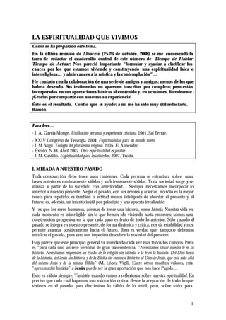1. El documento describe la evolución de la espiritualidad vivida por muchas personas en España tras la posguerra. Inicialmente, la espiritualidad se centraba en prácticas piadosas impuestas por la Iglesia y desconectadas de la vida real. 2. Posteriormente, la crisis de este modelo, la reivindicación del laicado, el Concilio Vaticano II y la reflexión crítica llevaron a cuestionar esta espiritualidad y buscar nuevos caminos más integrados en la vida y el mundo. 3. Hoy en día,