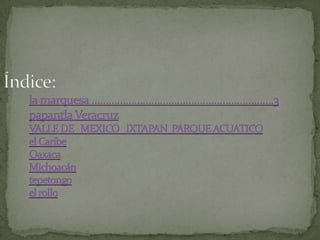 Este documento presenta información sobre varios paquetes turísticos, incluyendo destinos, medios de transporte, alojamiento y alimentación. Proporciona detalles como precios y enlaces de sitios web para 3 destinos turísticos principales - la Marquesa, Papantla y el Caribe. También compara 2 paquetes turísticos al Parque Acuático, con diferencias en los costos de transporte, comida y alojamiento.